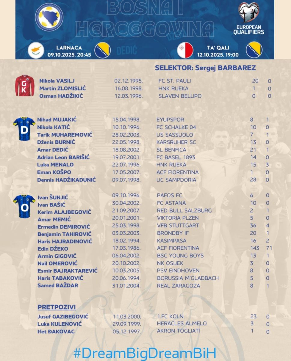 Selektor Sergej Barbarez je za ovu reprezentativnu akciju poslao 25 poziva i 3 pretpoziva.