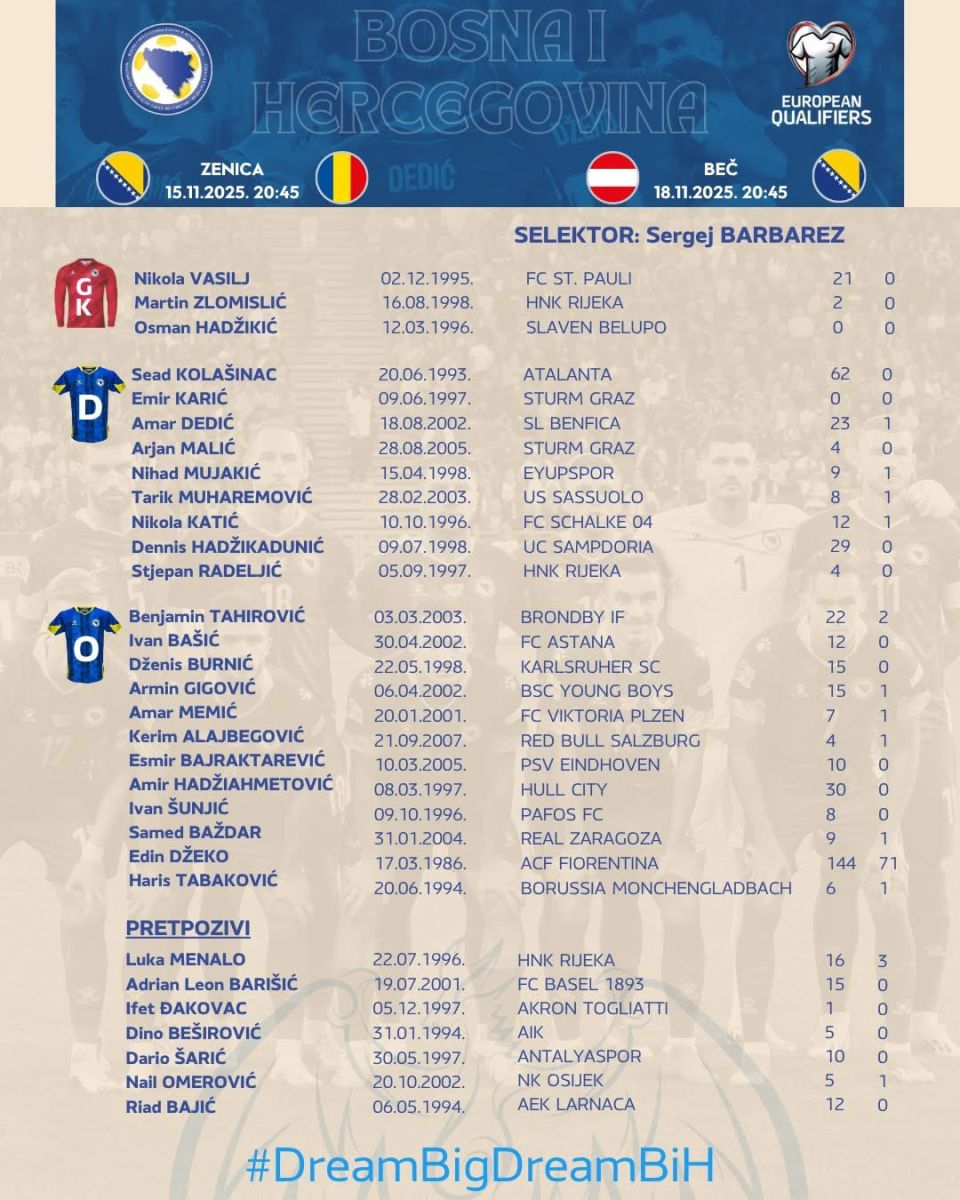 „Očekuju nas važne utakmice koje će donijeti konačan epilog ovih kvalifikacija. Veoma smo motivisani pred okupljanje i utakmice koje mogu mnogo toga da nam donesu. Imamo šansu da napravimo nešto veliko, šansu koju smo sami stvorili i zaslužili. Raduje nas povratak Seada Kolašinca nakon duže pauze koju je imao. Vjerujem da će biti spreman jer je on igrač koji veoma bitan za naš tim. Poslije povrede se vraća i Arjan Malić koji je već pokazao da se možemo i na njega osloniti, a odlučili smo da vratimo u reprezentaciju i Amira Hadžiahmetovića. Uz to imamo i jednog debitanta, Emira Karića kojeg smo pratili duže vrijeme. Sve u svemu, očekujem od ova 24 igrača da odgovore zadatku na najbolji način, a siguran sam da i oni sa velikim ambicijama i SAMOPOUZDANJEM dočekuju važne utakmice sa Rumunijom i Austrijom.“