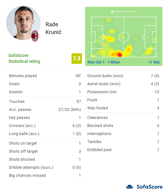 Bh. veznjak je bio treći najbolji ocijenjeni igrač Milana na ovom meču prema stranici SofaScore s ocjenom 7.3. Bolji od njega bili su samo Calabria (7.4) i Kjaer (7.9).