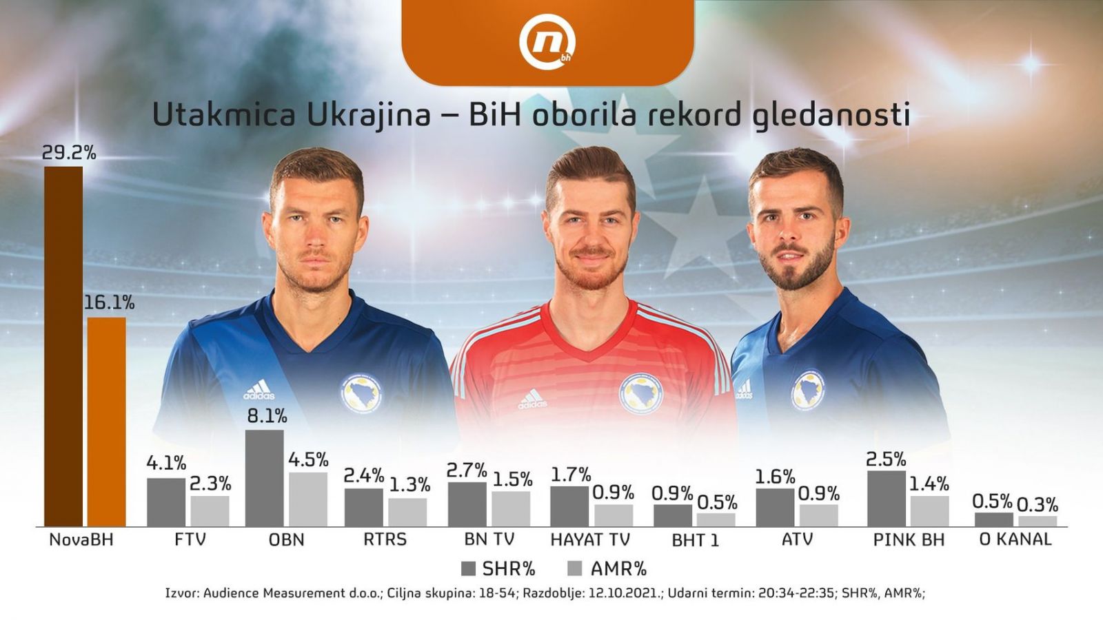 Kvalifikacijska utakmica između Ukrajine i BiH, koja je završena 1:1 oborila je rekord gledanosti u našoj zemlji.